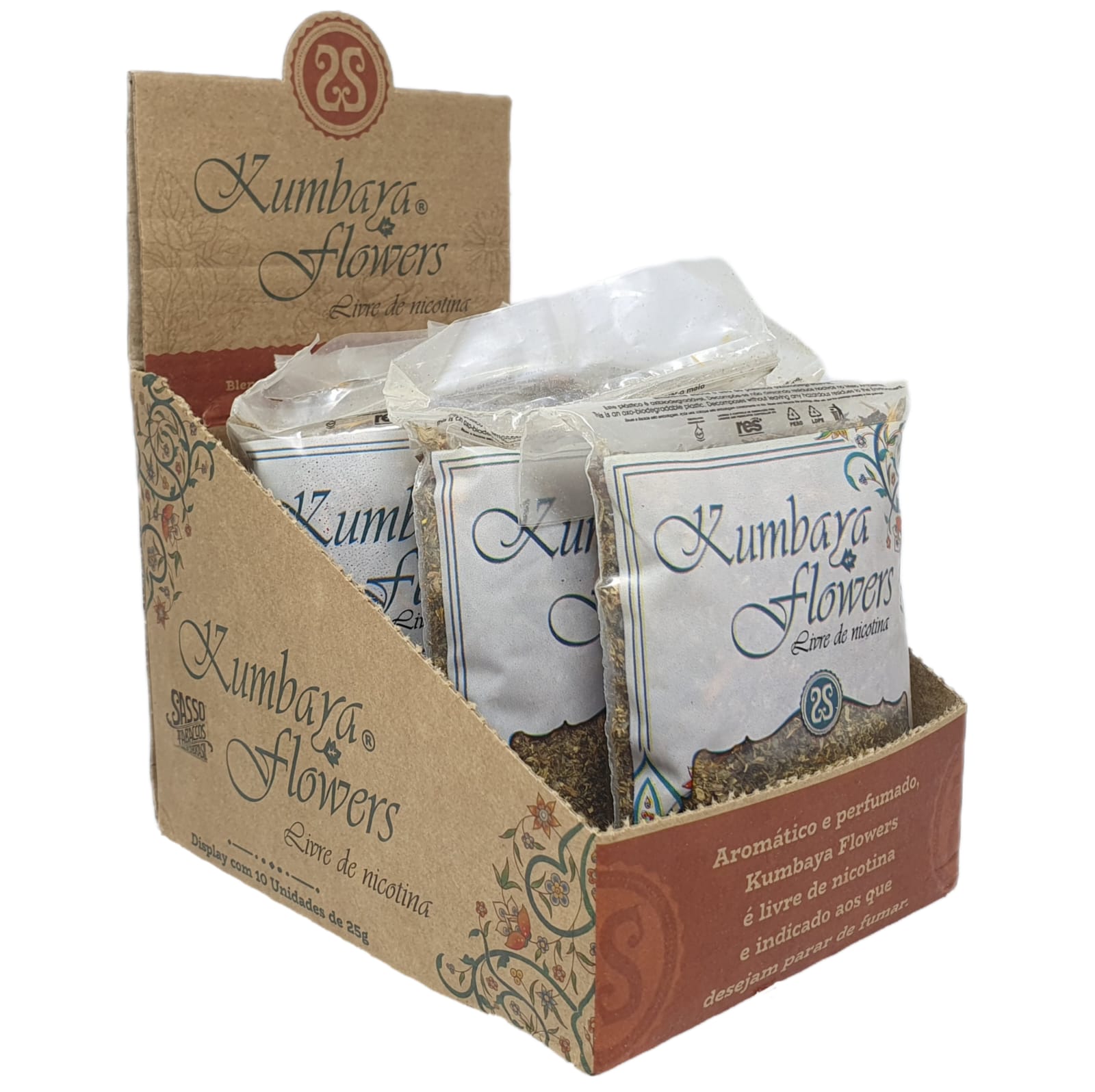 O Kumbaya Sasso é feito com Pétalas de Rosas, Calêndula, Camomila, Sálvia, Jasmim e Menta. Não contém nicotina. Embalagem com 25g. Uma opção menos agressiva para quem gosta de fumar. O Fumo Kumbaya Flowers contém em sua composição uma série de significados o que faz um grande diferencial . Esse é o Kumbayá, um cigarro natureba que ajuda as pessoas a largarem o vício do fumo. Com apenas 20% de tabaco em sua composição pode ajudar a você diminuir a absorção de tabaco pelo seu organismo e quem sabe até mesmo parar de fumar.